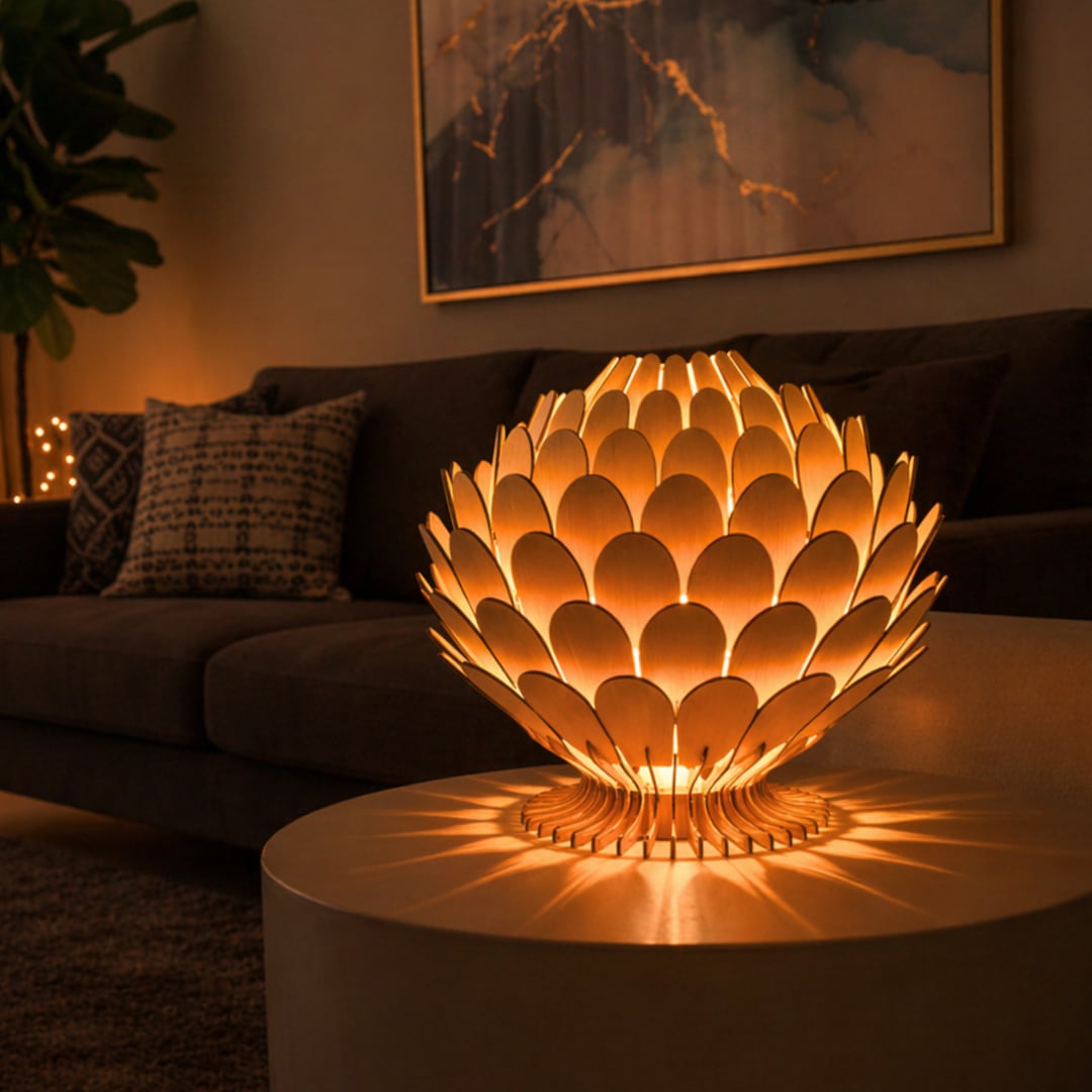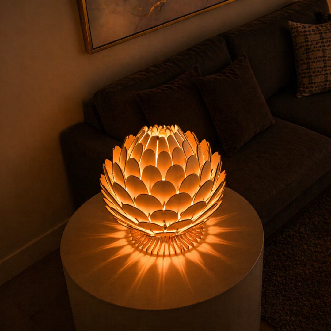 花びらのように重なる木製パーツが生み出す、印象的なシルエット。